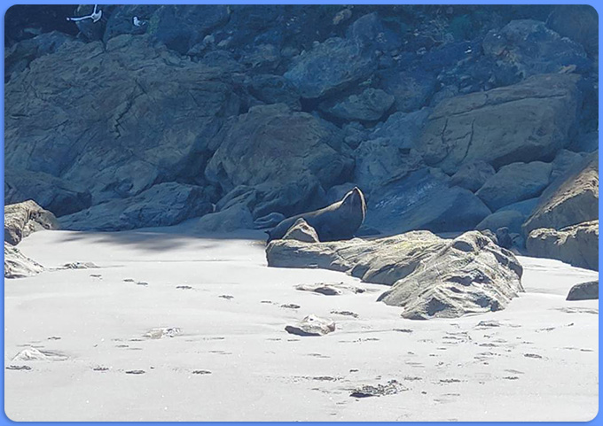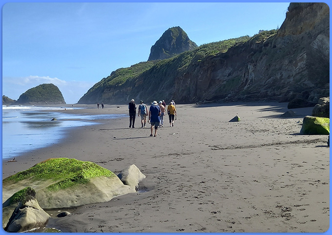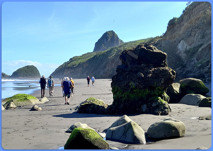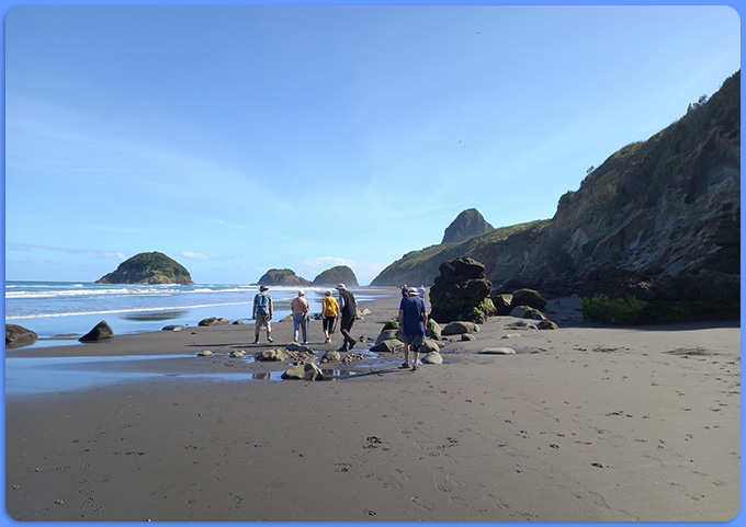 Blue skies and incoming tide meant perfect conditions on Back Beach this morning for our Moderate Walking Group. We kept well away from the seal and her baby!